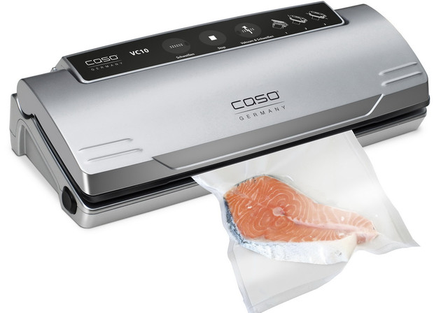 Вакуумний пакувальник Caso VC 10 відноситься до розряду побутового обладнання для створення герметичної середовища для їжі. Такі пристрої працюють допомогою розміщення їжі у вже готовому вмістилище, з якого потім забирається повітря. Дана модель забезпечує досить швидку роботу з продуктивністю, що дорівнює 9 л/хв. забезпечує Її насос створює тиск рівня 0.8 бар. Даний вакууматор також запаює шов на пакеті (адаптований на упаковки, ширина яких не перевищує 30 см). З цим приладом вам гарантована проста і якісна обробка такої їжі як овочі та фрукти, риба і м'ясо, тверда і м'яка їжа.